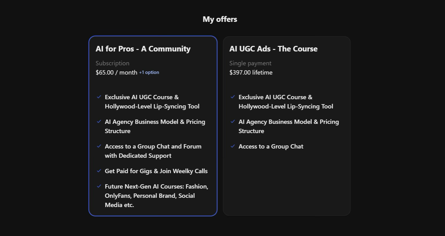 Then, there’s the “AI for Pros Community”, which unlocks the group’s entire whop with all the features I mentioned above. This package costs $65 a month and includes an initial fee of $345, which is basically like purchasing the “AI UGC Ads Course” package.