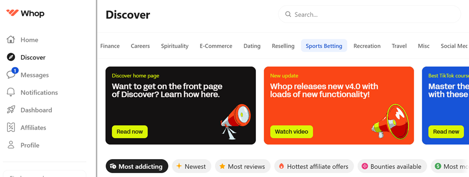 Visit Whop and click on the sports betting tab to uncover a long list of reliable handicappers. There’s plenty to choose from, and you can filter by the newest, most addicting, most reviews, hottest affiliate deals, bounties available, and more.