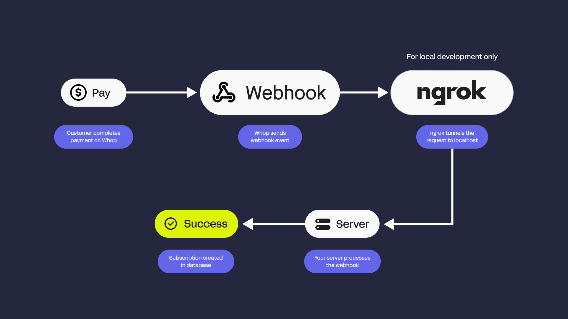 - Payouts - Creators withdraw funds via the hosted Whop payout portal