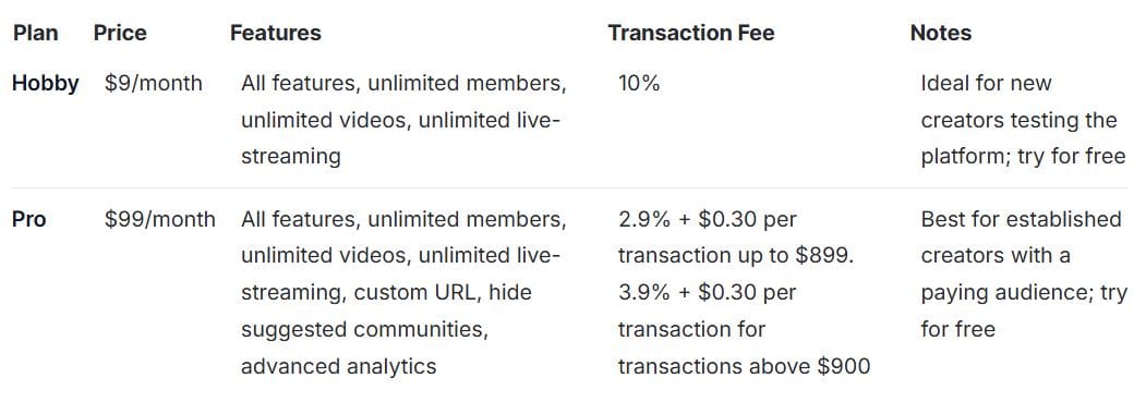 - Skool's $99/month subscription includes unlimited courses and members but limits you to one community per plan.