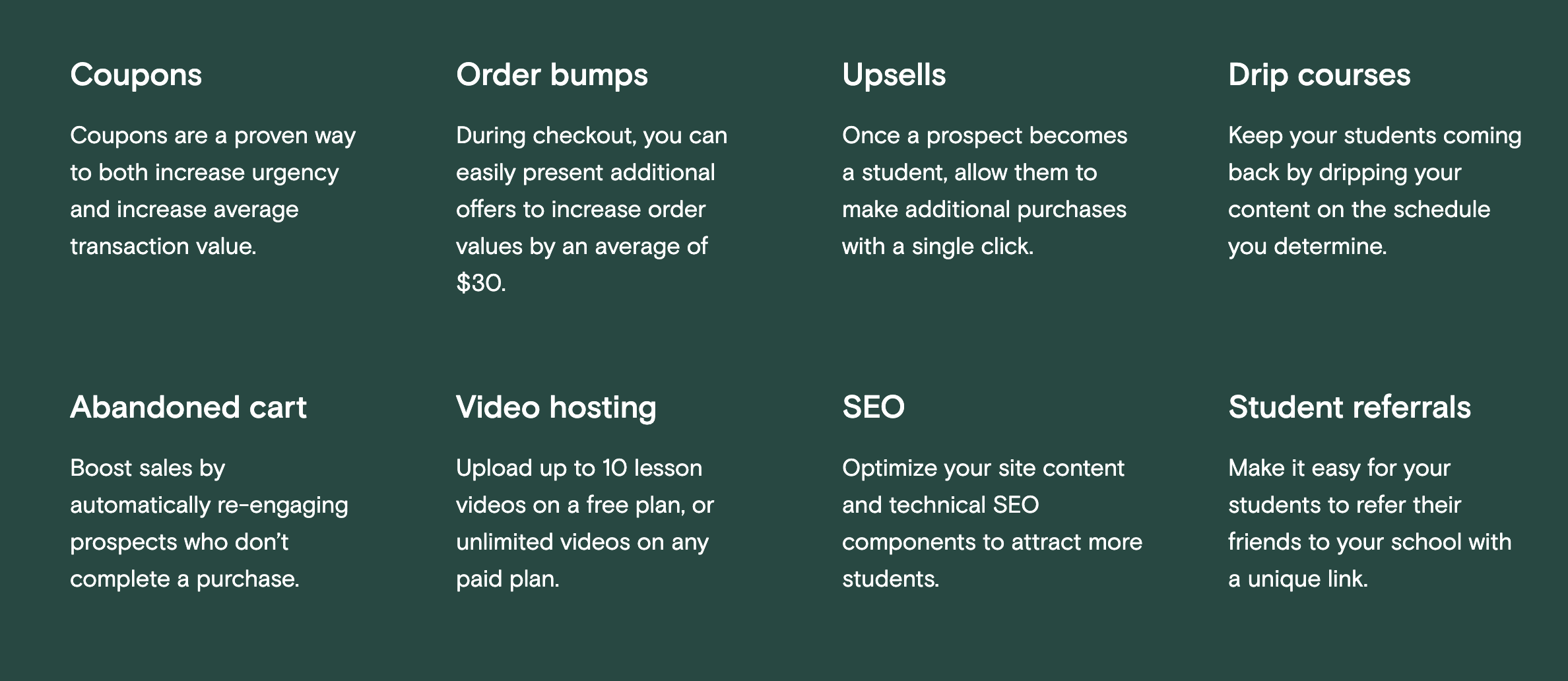 Teachable offers some powerful student-level analytics to help coaches keep track of their students. This can be useful for holding students accountable and motivating them on longer courses. There is also a large number of marketing tools to help you gain new students, from coupons to upsells, abandoned cart emails, and even SEO help.