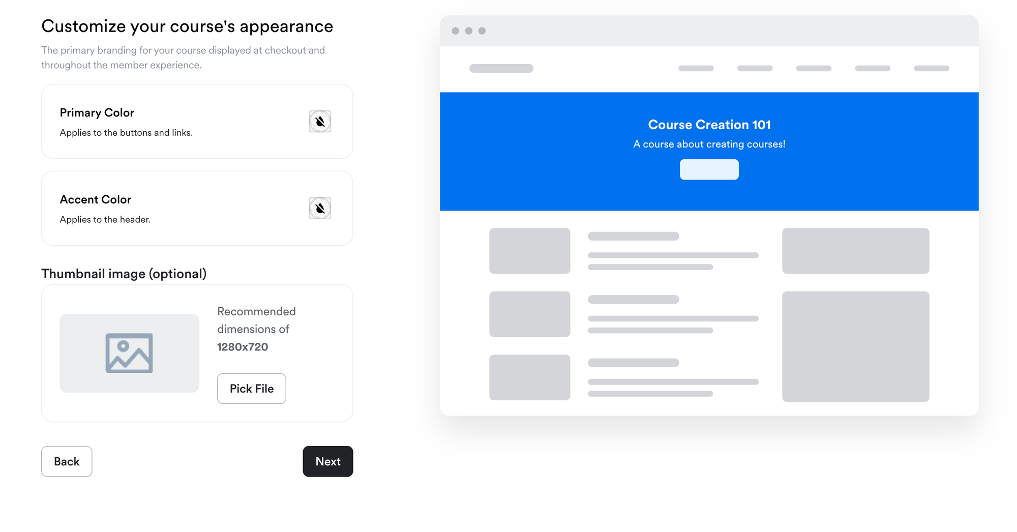 The customization features available depend on the tier of plan you're on. Coaches on lower-tier plans will have their content shown on a Teachable-branded page. Pro tier and above members can remove Teachable branding from their course pages.