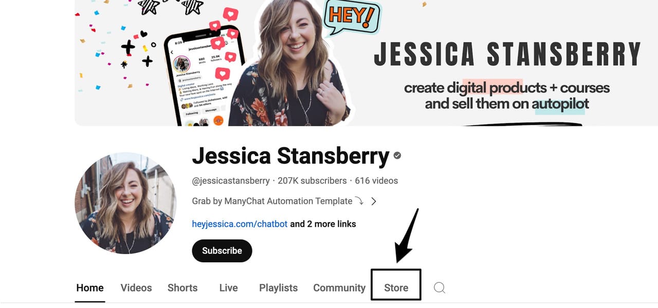 The Store Tab automatically shows up on your home page menu bar. For example, Jessica Stansberry sells merchandise on her channel.