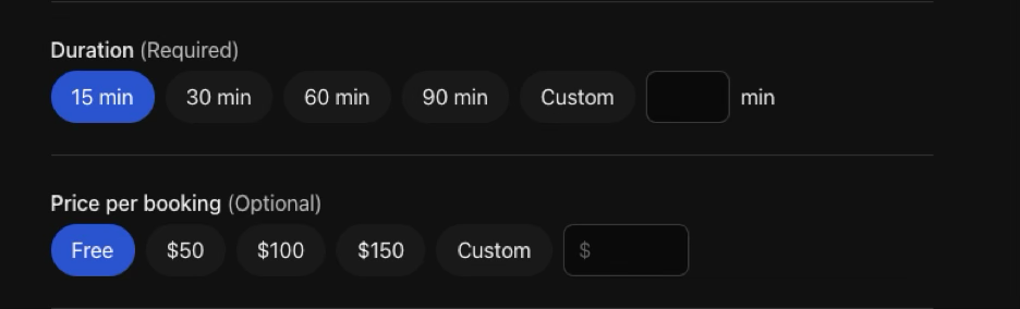 To set up session pricing, click on the Calendar Bookings app and add a booking fee for a specific duration.