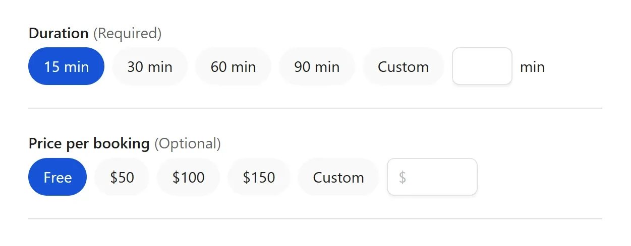 To set up session pricing, click on the Calendar Bookings app and add a booking fee for a specific duration.