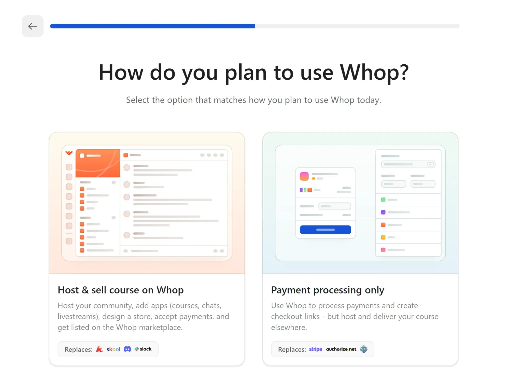 Next, select whether you're going to use Whop to host and sell services (option on the left) or as a payment processor (option on the right).