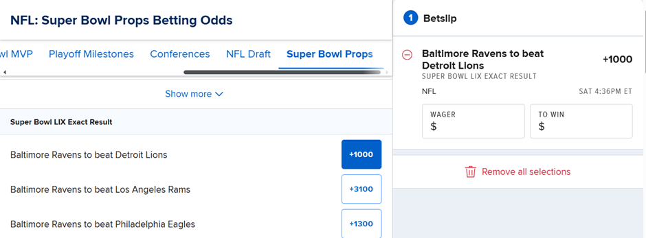 When searching for player props, you’ll also find markets like: 'How many touchdowns will the running back score over/under 1.5?' 'The total receptions from the wide receiver during the Super Bowl', and more.