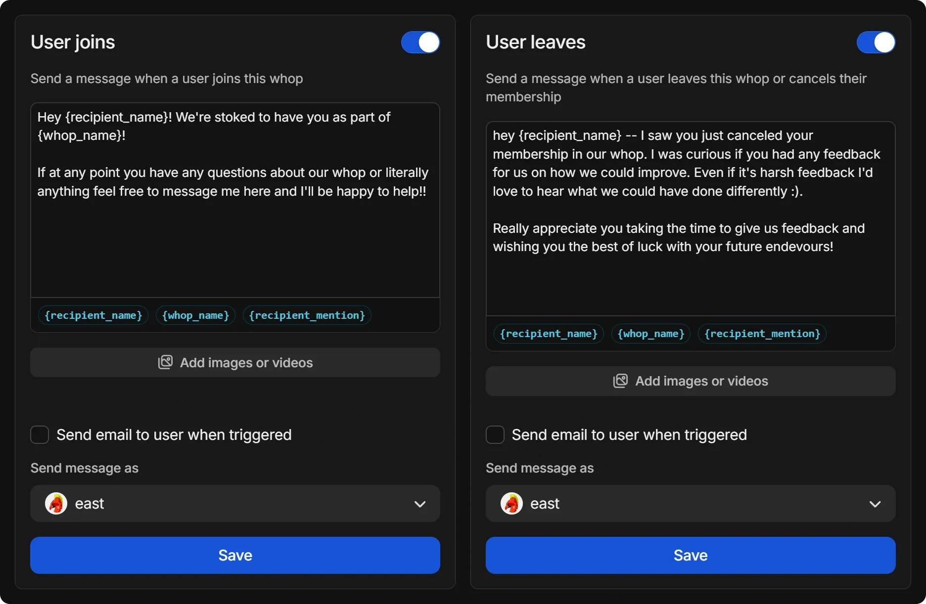 • User leaves will send a message to every user when they leave your whop