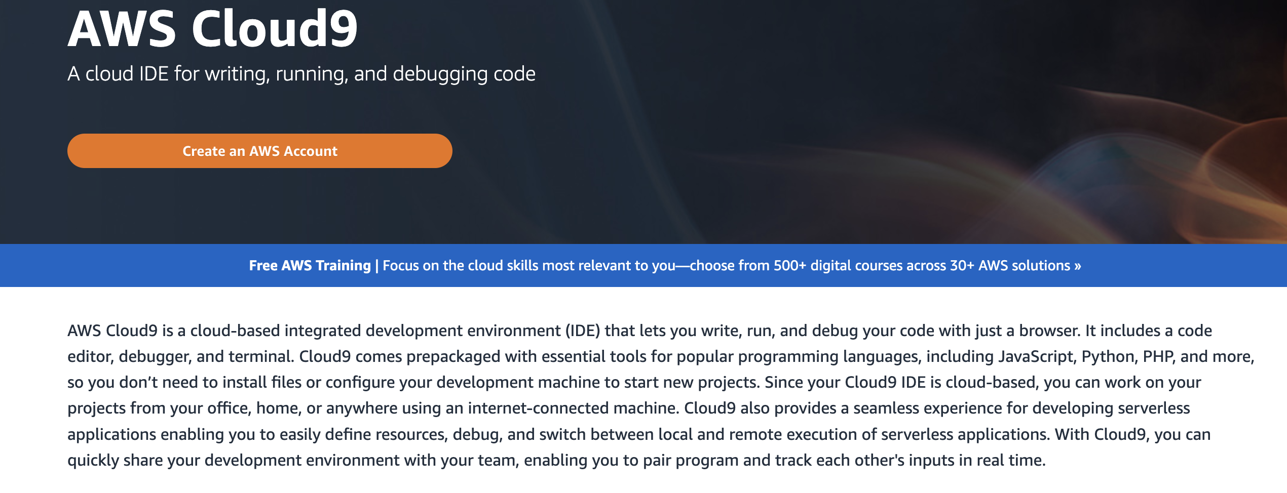 Cloud 9 is run by parent company Amazon and is a browser-based service that lets you write, run, and debug code. It supports several coding languages, including (but not limited to) C++, PHP, Python, and Javascript.