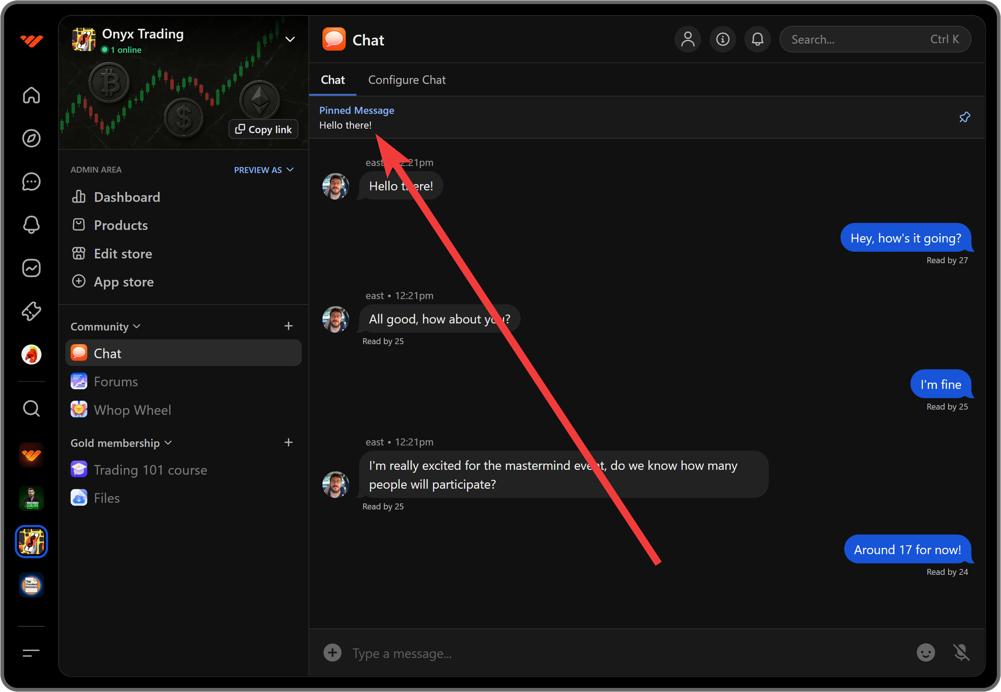 When you click the More button of a message, you're going to see the Pin message button in its context menu. Clicking on it will pin the message at the top of the app for all members of your whop to see.