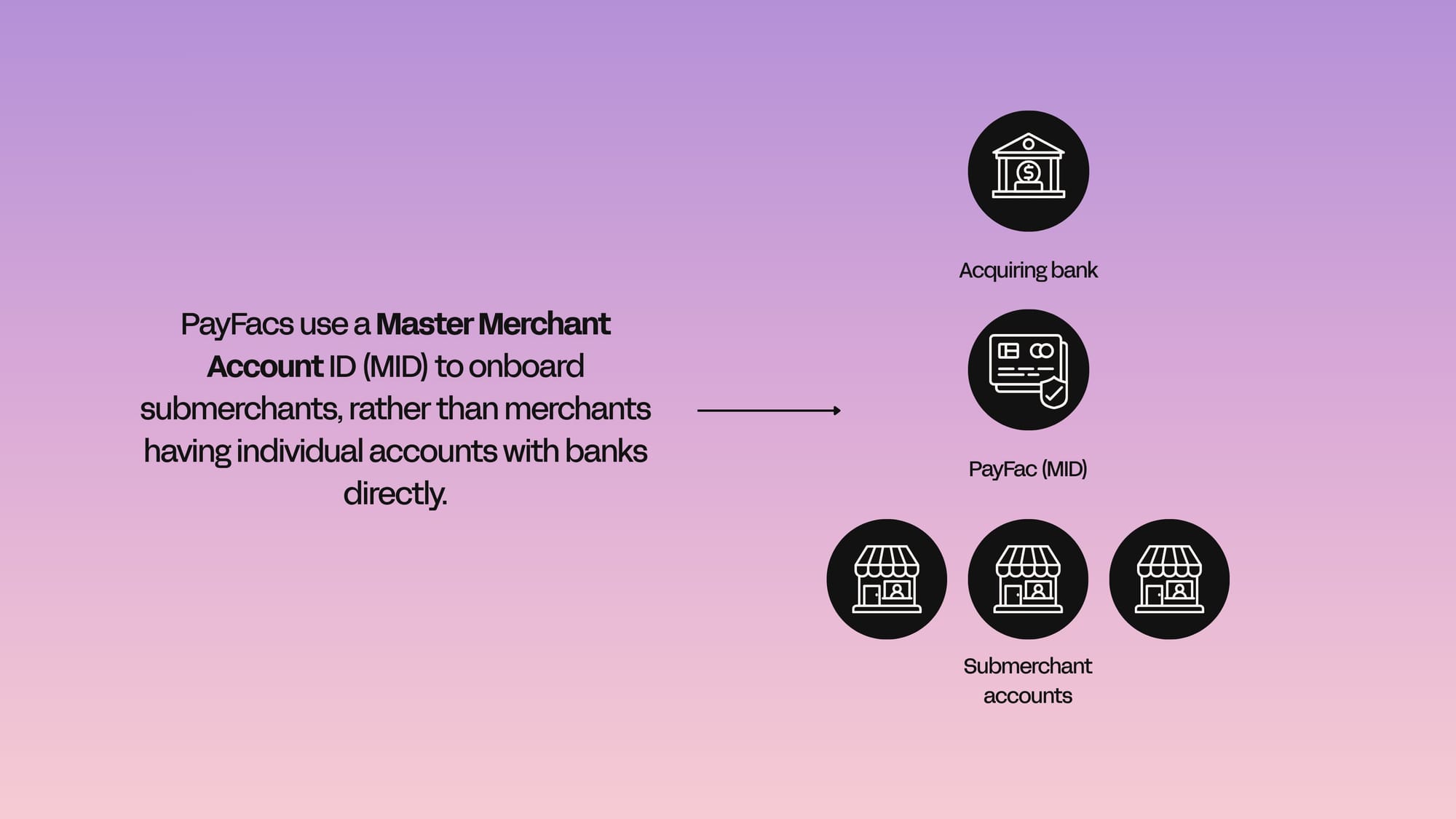 Each PayFac holds one master merchant ID (MID) with an acquiring bank. When you sign up with a PayFac, every user on your platform operates under that umbrella, rather than needing their own direct merchant account.