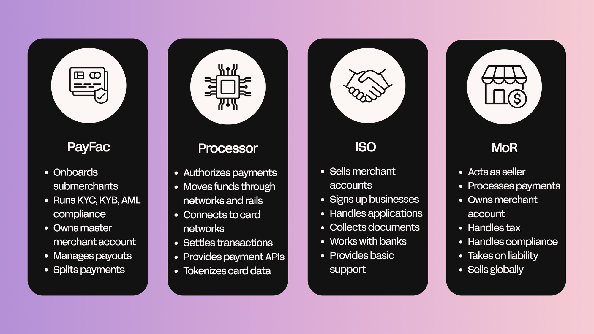 | Processor | moves money | merchant | payments infra |