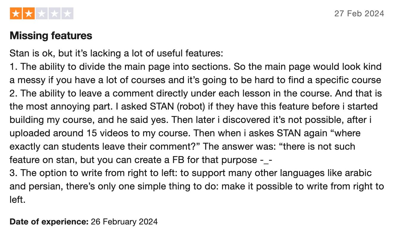 When reviewing any platform or app, it's always a good idea to understand how its user base feels about the product. We checked out Trustpilot to see what users are saying at Stan Store.
