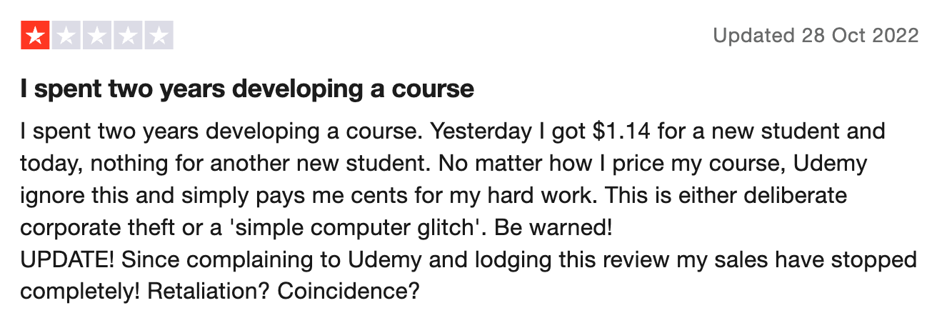All in all, users aren’t too hot on the platform as far as review score goes, with Udemy scoring an underwhelming 2.1 out of 5 from over 1300 reviews. There are also some instructor reviews in the batch detailing poor experiences with payments and customer support.