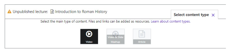 Now choose what sort of item you want to insert. Lecture is what we're talking about here, but you can use this same interface to add stuff like assignments, quizzes, and coding exercises too.