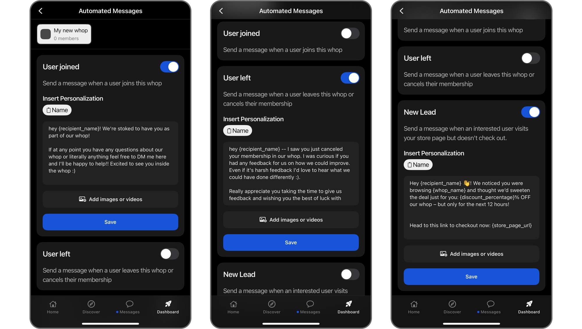 In the messages tab of your dashboard, you’re going to see four things: the whop you’re editing at the top left, the User joined card, the User left card, and the New lead card.
