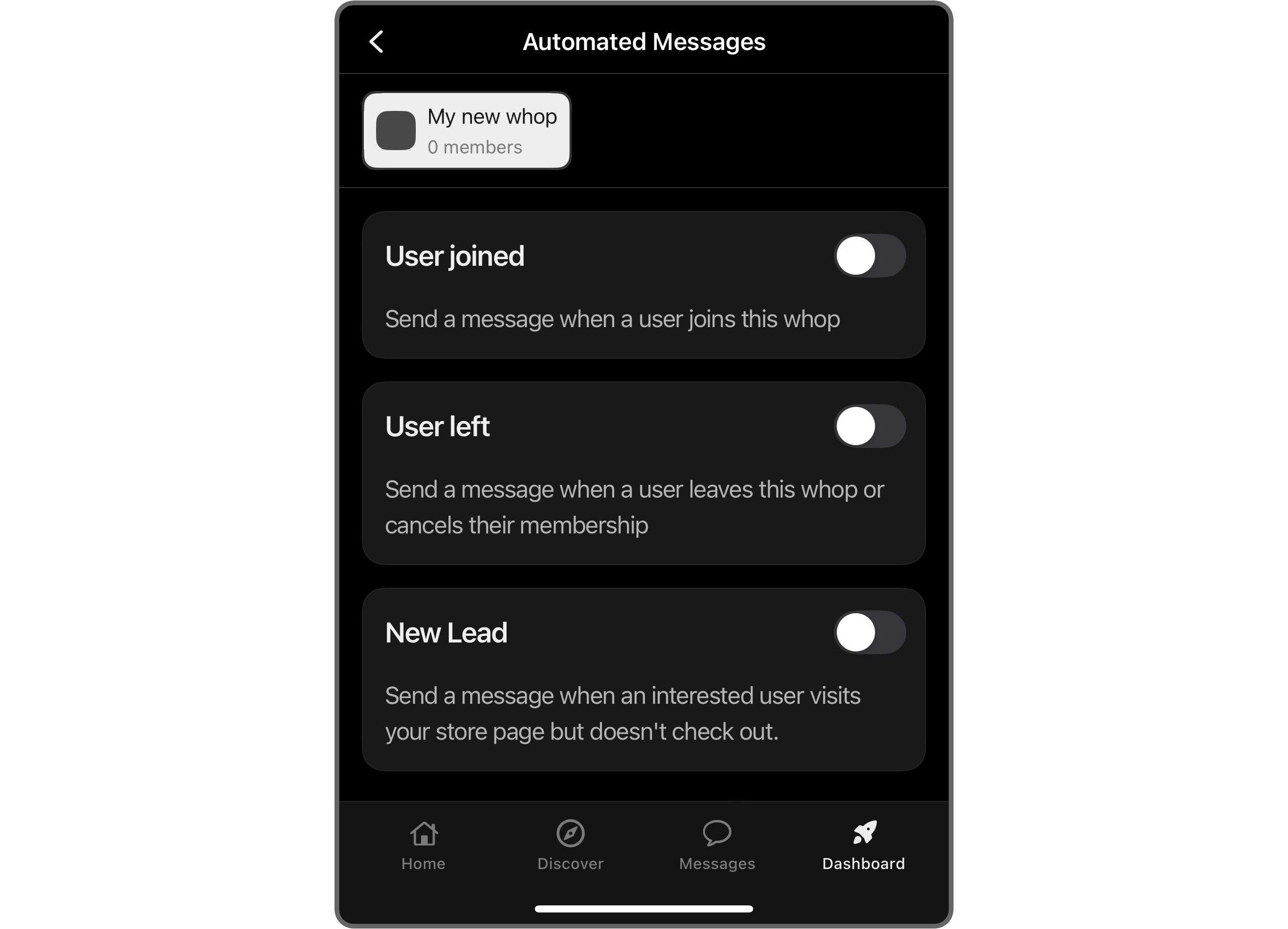 Turning on Automated Messages on the Whop mobile app is just as easy as doing so on desktop.