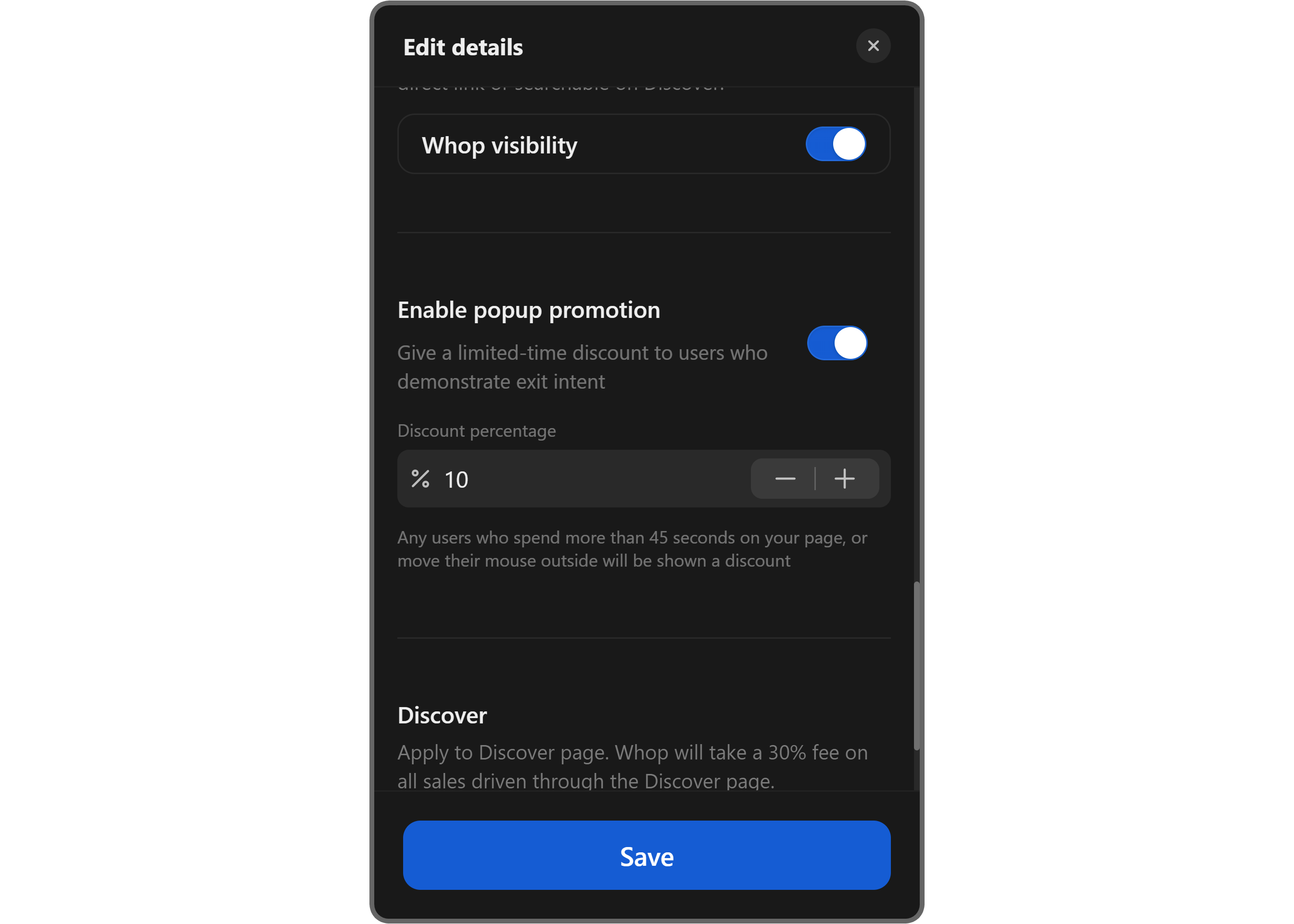 Clicking the Enable popup promotion button will direct you to your whop's store page and open the Edit details popup where you can adjust certain settings of your whop.