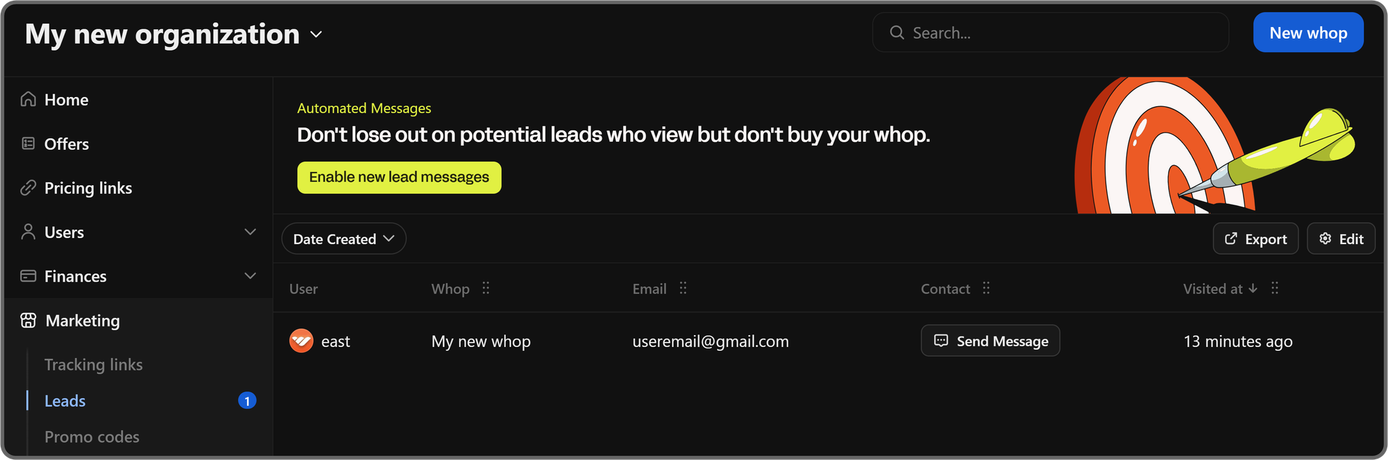 Normally, you'd see a list of all the leads whop generated for you, but since you haven't set up the feature yet, you're going to be prompted to enable the popup promotion feature for your whop.