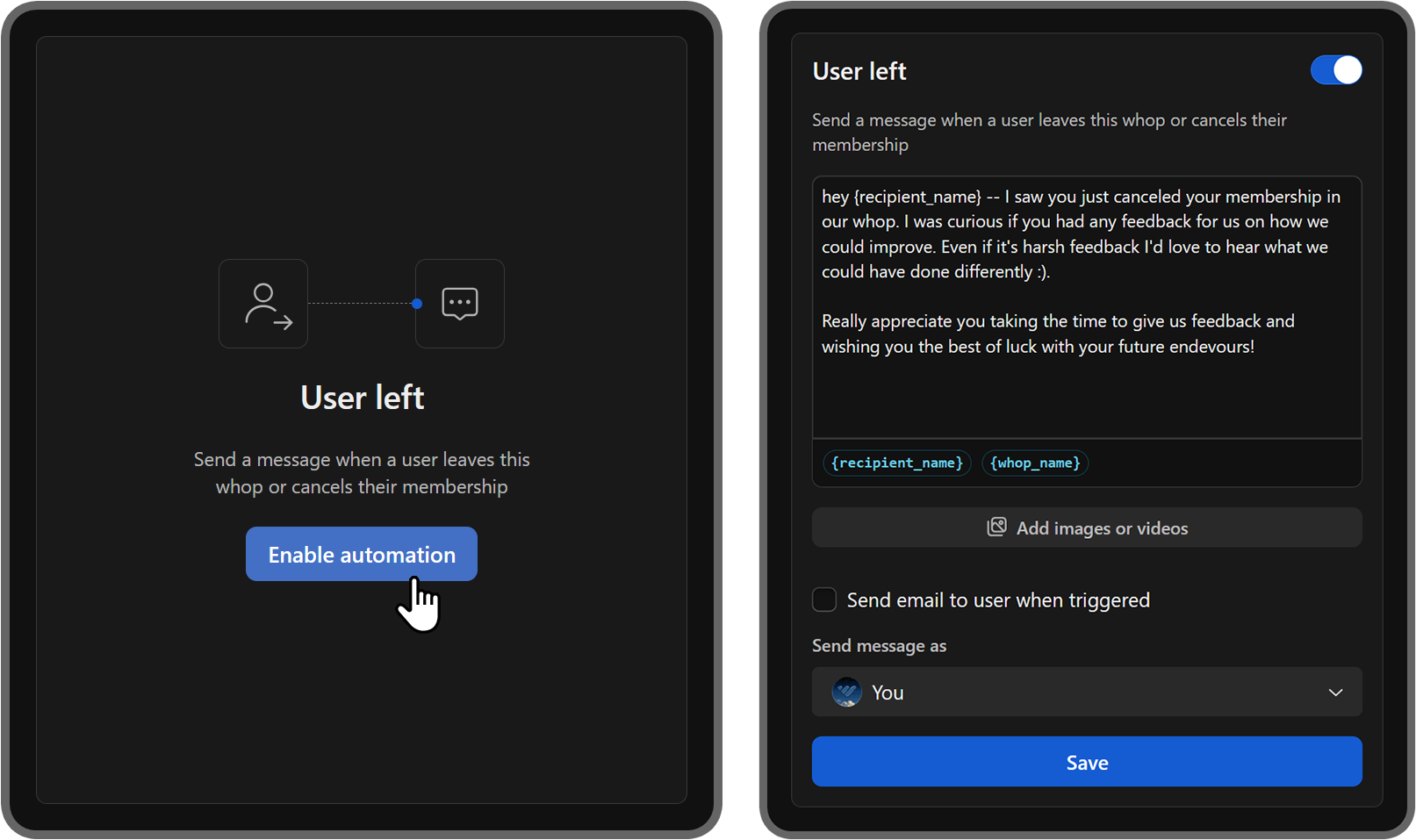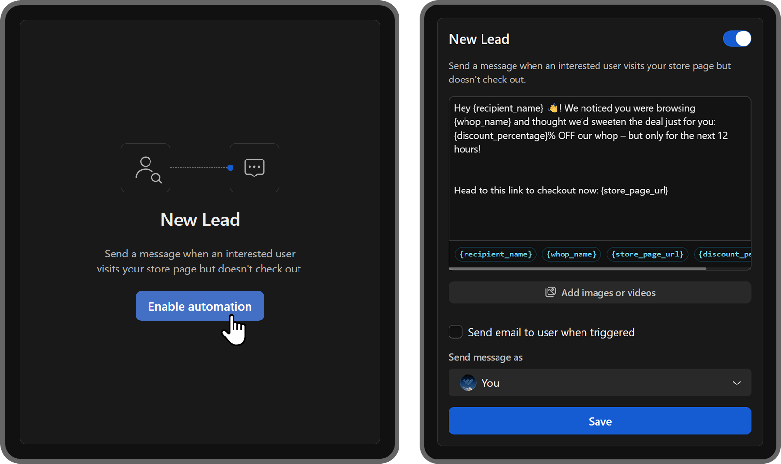 From now on, all users who join or leave your whop or visit your store page and leave without making a purchase will get personalized messages from you, automatically.