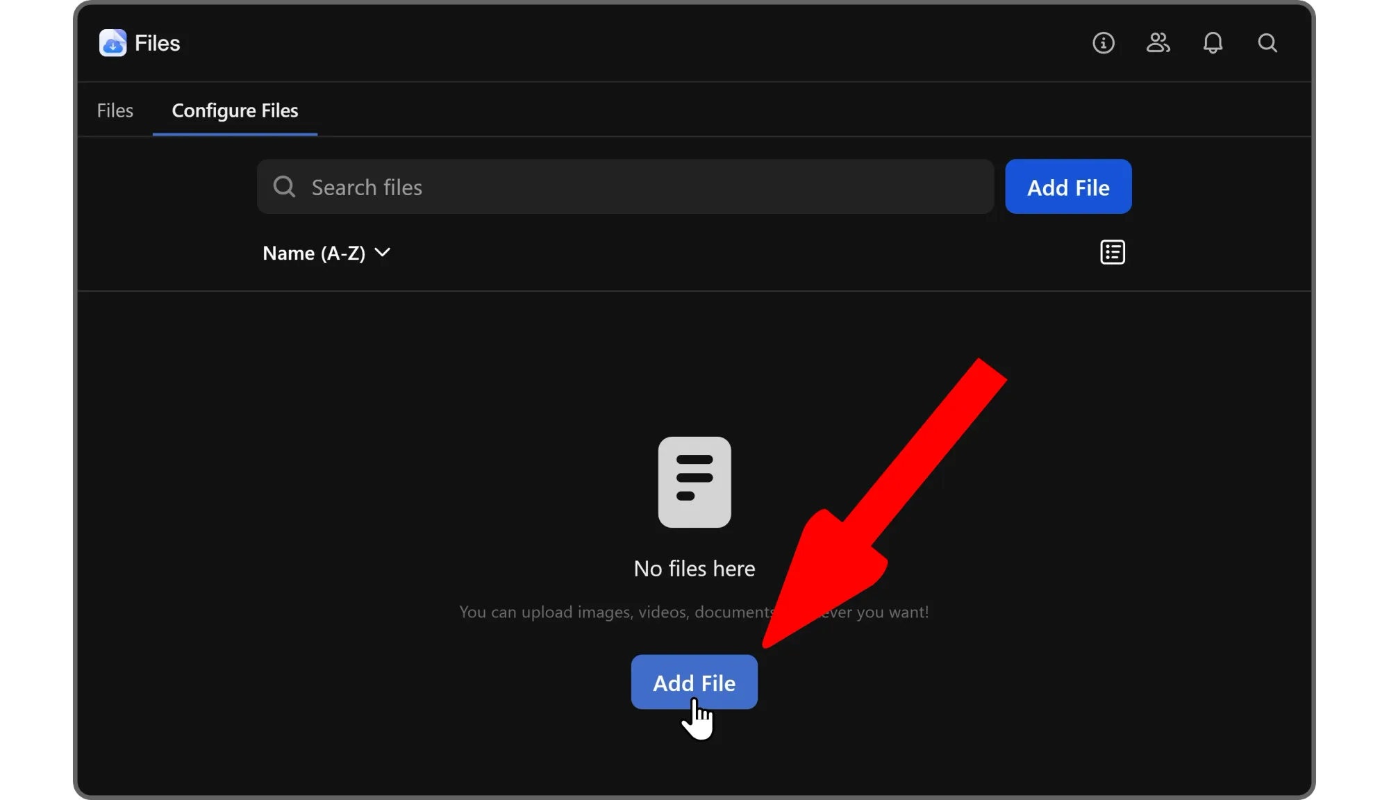 Let's click either one of the Add file buttons on the app to see the file selection dialogue. There, selecting a file will start uploading it to the app, and your members will be able to access and download the file right away.