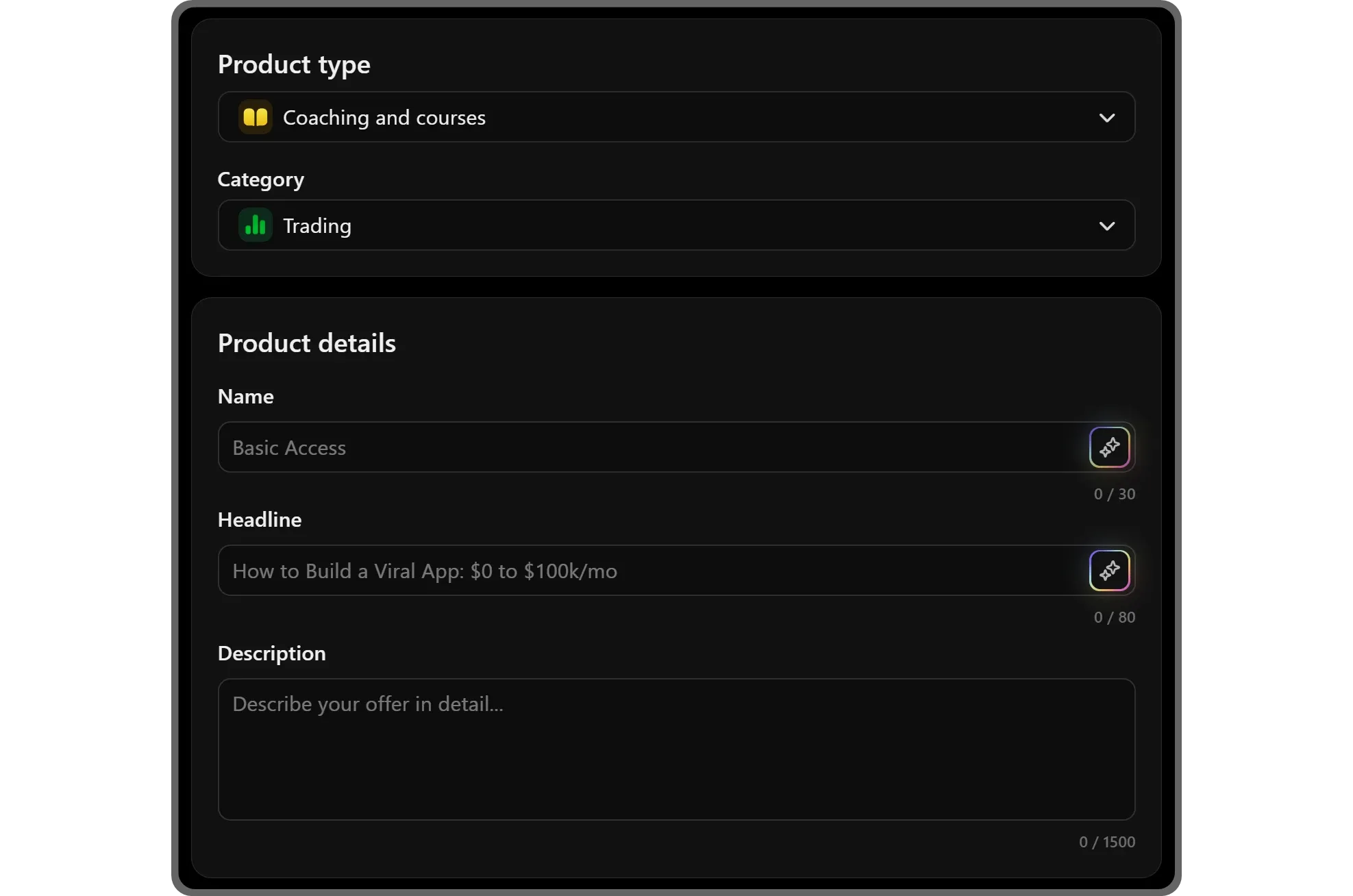 In the product details field, you should give your product a name, a headline, and a description. Not sure about them yet? Use the Generate with AI button on the right side of the input fields. But remember, being unique is a plus.