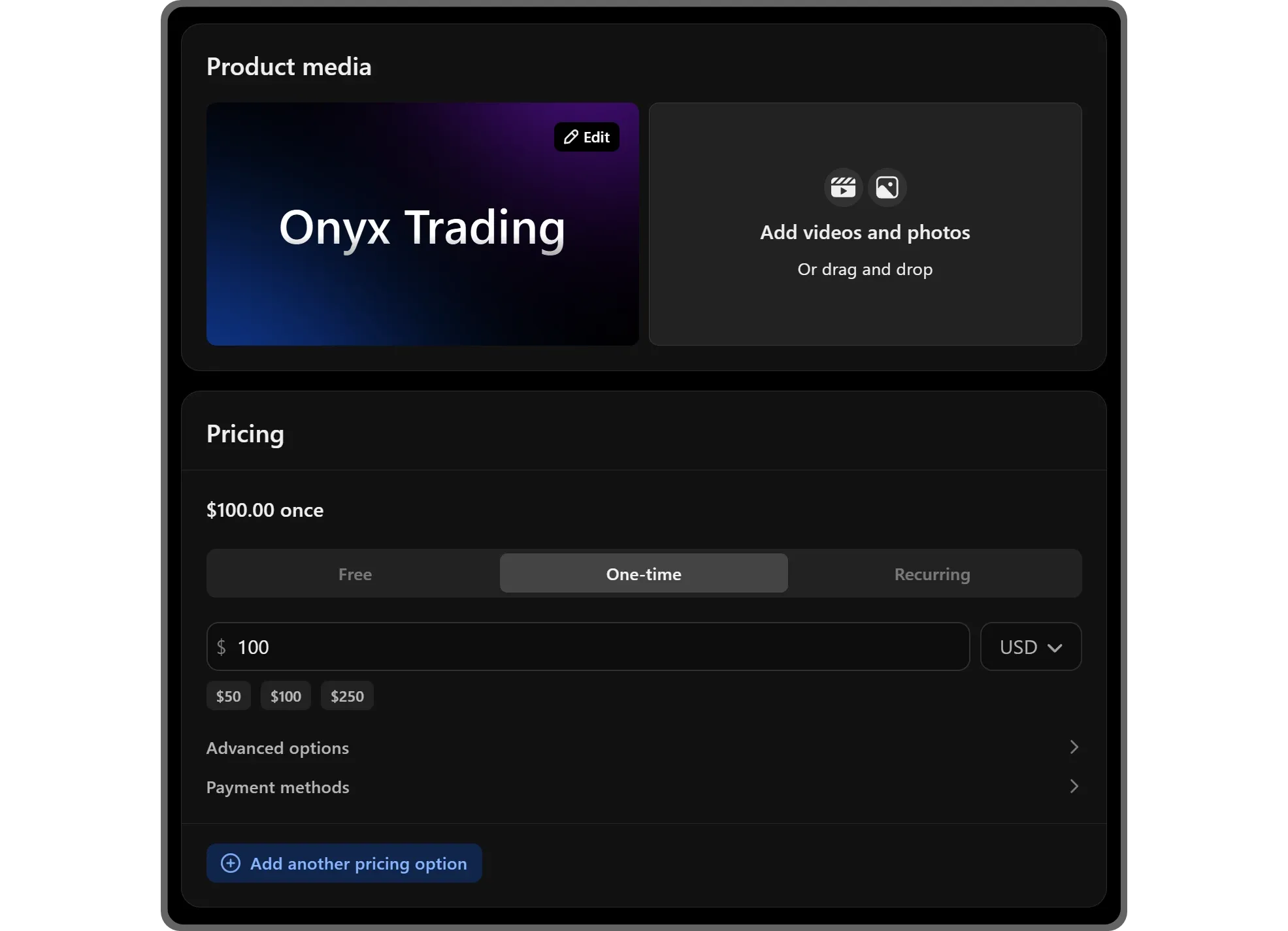 Make sure to check out the Advanced options and Payment methods dropdown menus to further customize your product's pricing.