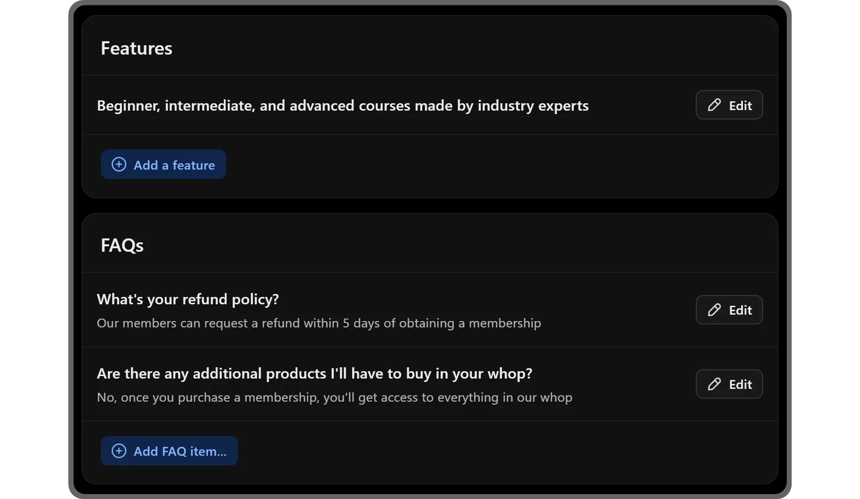 The Features and FAQs fields, as their name suggests, allow you to list your product's features and FAQs. These are great to fill the empty space in your store page and help your members get more information before they make a purchase.
