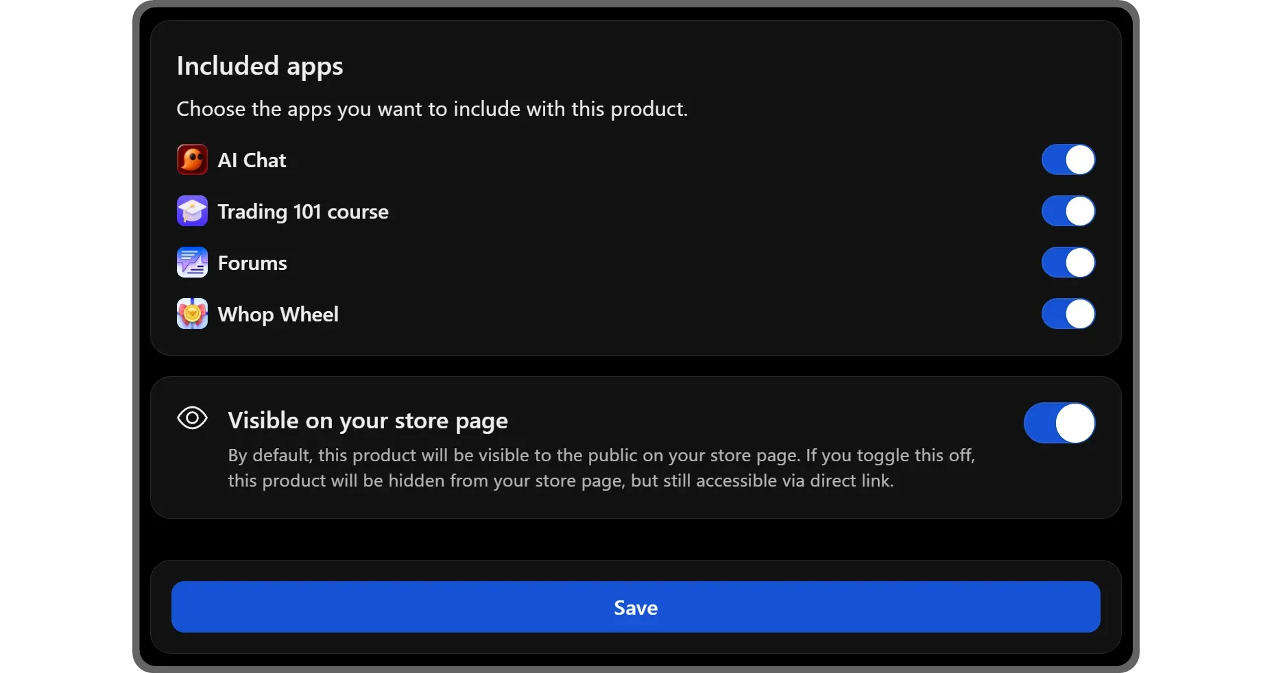 The Visible on your store page toggle option, on the other hand, should be enabled by default and as its name suggests, it controls whether the product is listed on your whop's store page or not.