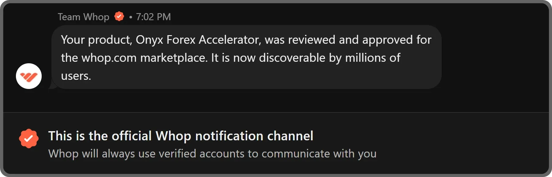 Once all of these are complete, you'll receive a message from Team Whop about your product being listed on the marketplace. If any issues arise about the listing, you'll also get notified via the same chat.